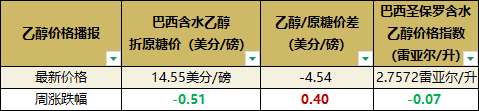 巴西最新含水乙醇折合原糖價(jià)格為14.55美分/磅,周環(huán)比下跌0.51美分,但由于原糖價(jià)格高位回落,糖醇價(jià)差從上周的4.94美分縮小至4.54美分。盡管如此,糖廠生產(chǎn)乙醇的收益繼續(xù)弱于產(chǎn)糖。