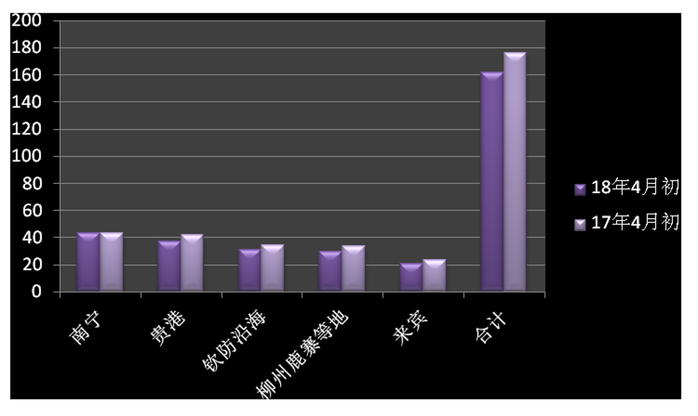 2018年4月份廣西各地區第三方倉庫庫存相比2017年4月份減少7.9%,原因一是糖廠積極銷售,二是為減少成本,糖廠生產期間增加廠庫存糖。