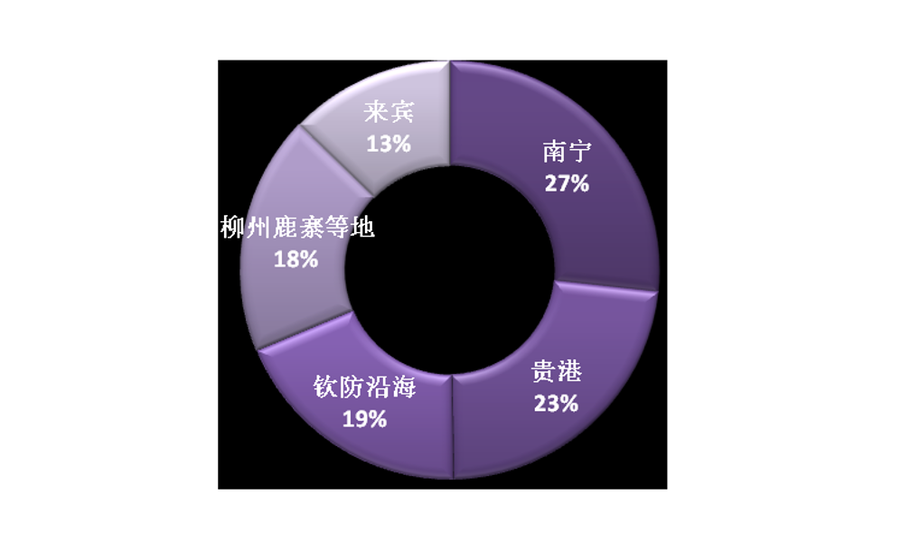 分布圖顯示,4月份廣西南部區域(南寧、貴港、欽防沿海)庫存占到了總庫存的7成左右,這與糖廠的分布有關。