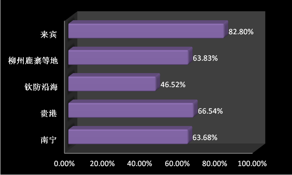 當前來賓地區倉庫的庫容利用率較大,達到了82.8%,主要是由于該地區總庫容較小以及該地區具有水運、鐵路及公路運輸優勢。