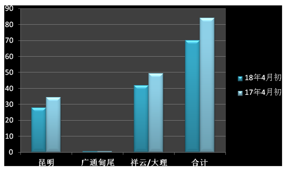 2018年4月份云南各地區第三方倉庫相比2017年4月份同期減少16.76%。與廣西情況類似,主要是由于糖業集團積極銷量,其次是廠倉仍有部分庫存。