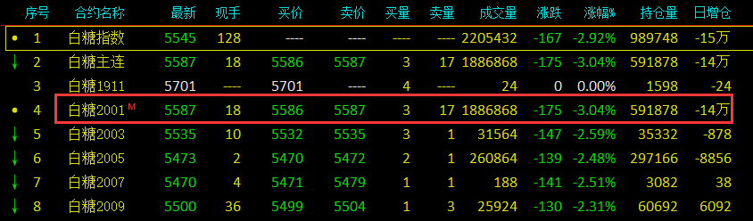今日鄭州白糖期貨大幅下跌,在上市交易的合約中,跌幅從2.31%-3.04%不等,近月合約跌幅最大,如圖一所示。