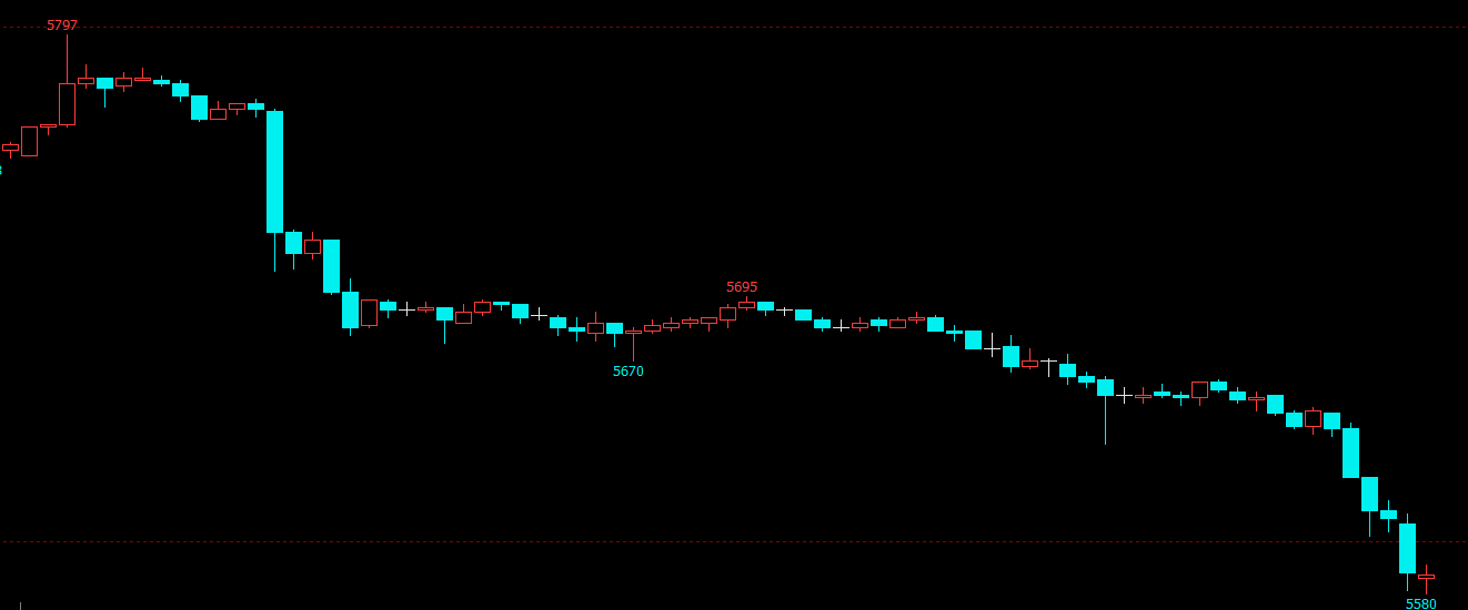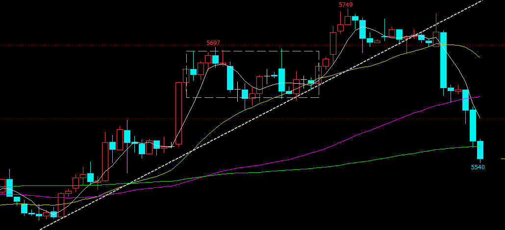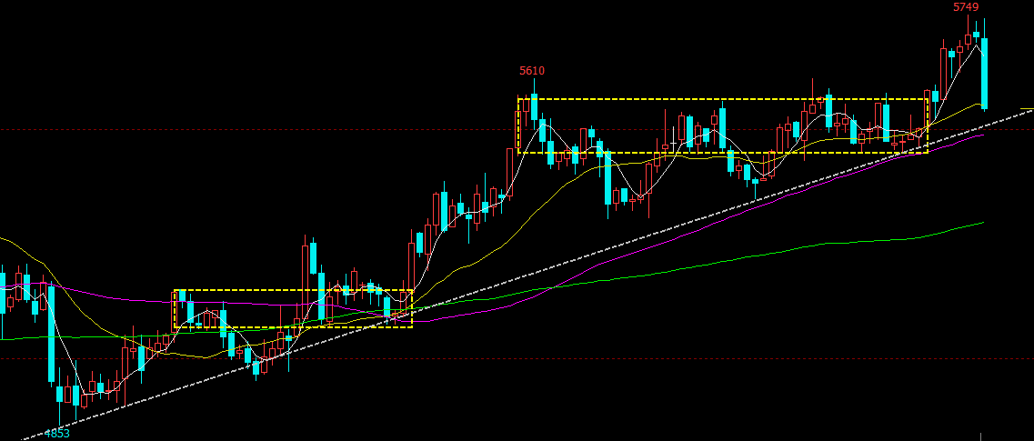 作為主力合約的2001合約(圖二),日內最高漲至5797,最低跌至5580,一天之內上下217個點,如你有單在其中,或許一天之內就能感受到“天堂”與“地獄”的差別,特別是在滿倉的情況下,時至收盤收于5587,收盤統計下跌175個點,跌幅達3.04%。從歷史走勢圖看,價格經歷了拉高上漲再大幅回調的過程。