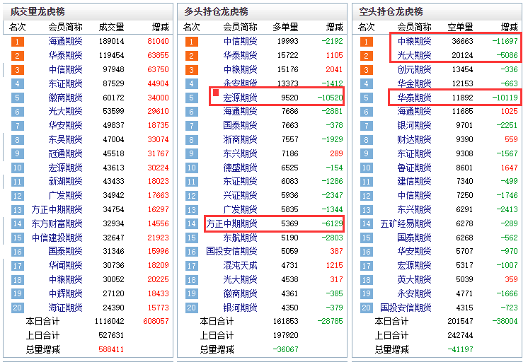 今日價格大幅下跌,SR001成交量188.7萬,至收盤持倉59.2萬手,持倉減少14.5萬手。看持倉龍虎版(圖四),板上排名前20中,多頭減少3.6萬手,減倉最多的發生在宏源期貨、方正中期、海通期貨席位;空頭減少4.12萬手,減倉最多的發生在中糧期貨、華泰期貨、光大期貨席位。從持倉龍虎版看,今日多空雙方多以減倉為主,增倉的席位微乎其微。