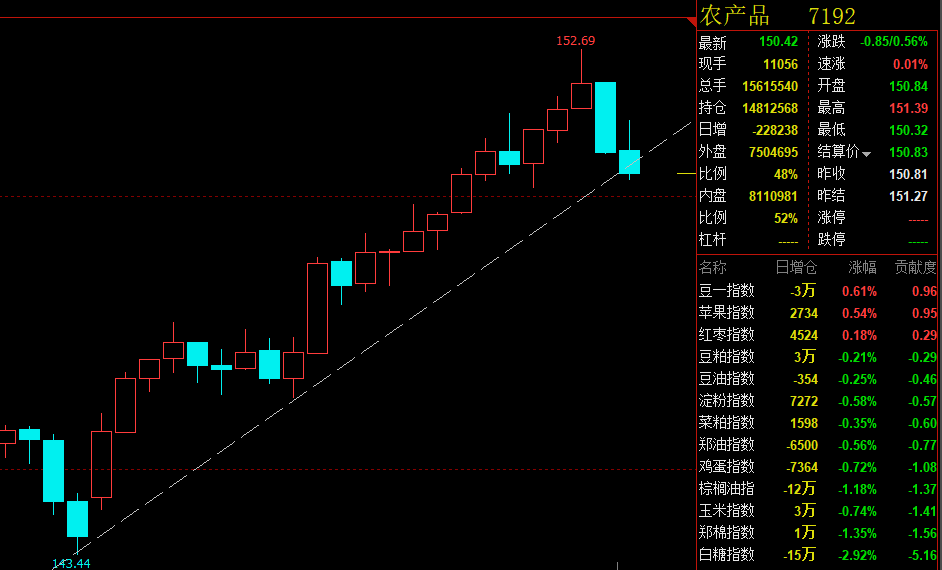 古人語“天時地利人和”,商品價格行情運行也需要。雖然國內基本面向好,中長期價格有向好的基礎,“天時”具備,但短期“地利、人和”不配合。從短期供需上說,南方即將開榨,新糖上市會越來越多;再從技術形態看,價格最近多呈通道運行,價格反彈剛好碰通道上軌受壓;再從資金面上說,最近幾日價格上漲持倉卻不斷減少,有獲利資金平倉;再從心理層面上說,雖然國儲出庫是傳聞,但價格越高,在供給偏緊的情況下,大眾擔憂會越重,影響短期看多勢頭;再看相關市場,近日國內農產品板塊指數高位逆轉下行、ICE原糖昨日相對高位下跌......諸多因素或多或少均是今日價格下跌的影響因素。