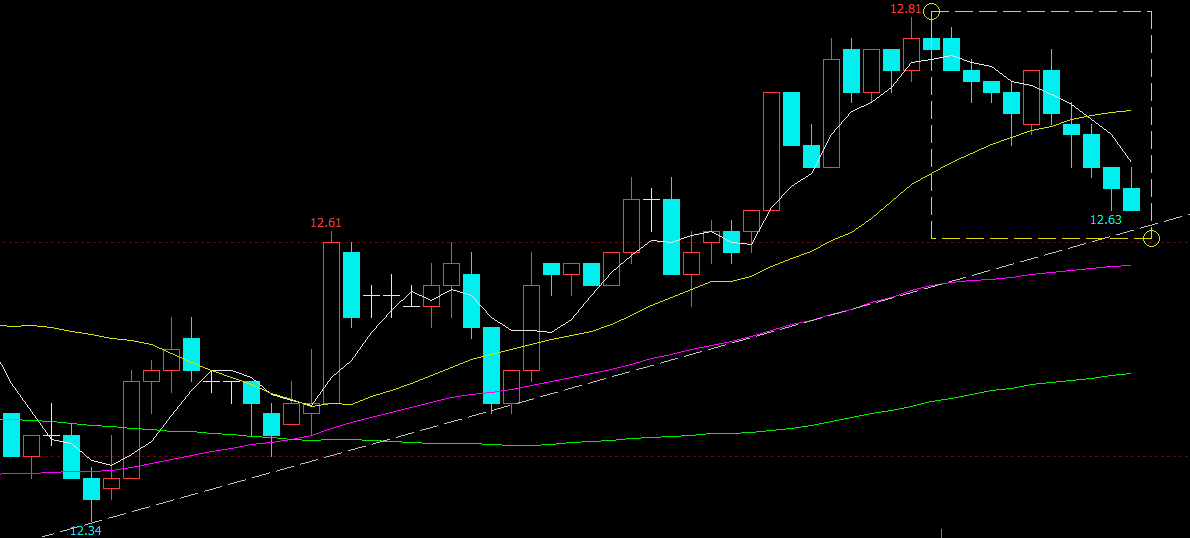 昨日原糖指數自12.81(圖十)高位回落,主要受巴西貨幣雷亞爾兌美元貶值影響。昨日原糖呈現下跌走勢,最低跌至12.63,靠近上升趨勢線,關注趨勢線支撐情況。