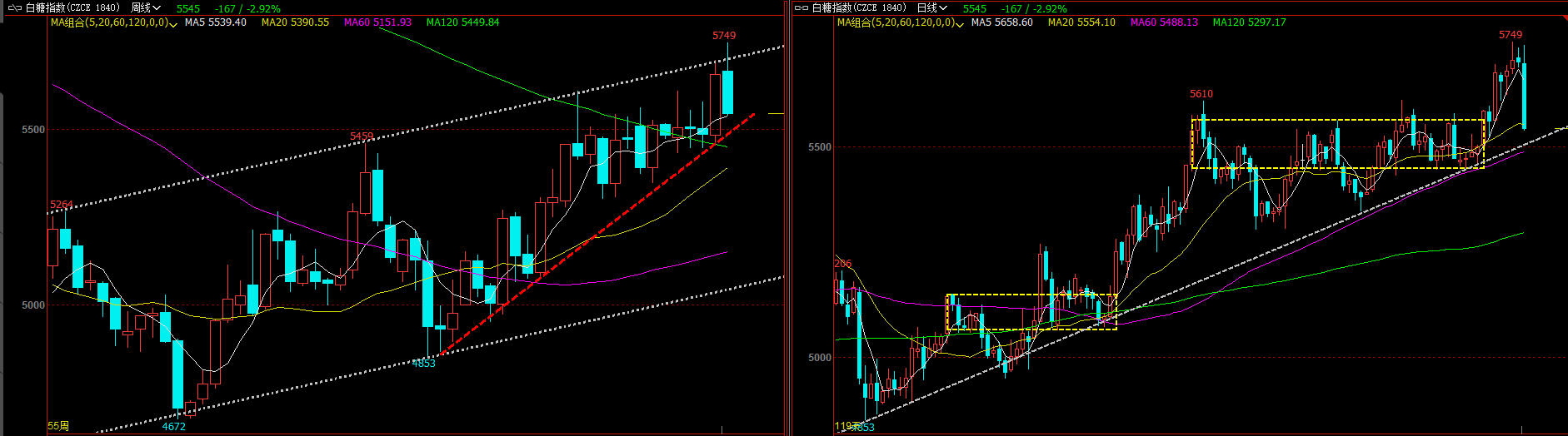 綜合看,周線周期價格呈上升趨勢,價格延上升通道運行,但近日價格高位受阻回落,本周周線還在形成中,重點需關注明日收市價格情況,關注上漲趨勢線(紅色線);日線周期價格今日回調跌進前方5562-5448中樞,關注中樞支撐情況、以及上升趨勢線(多次支撐價格上行),此中樞區間能否有效支撐將會是短期糖價多空的關鍵。